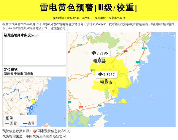 福鼎市气象台2022年07月15日17时09分发布雷电黄色预警信号:预计未来6小时,我市西部北部乡镇有雷电活动,局部伴有短时强降水、6~8级雷雨大风等强对流天气。请注意防范! 信息来源:国家预警信息发布中心; 发布单位:福鼎市气象台。