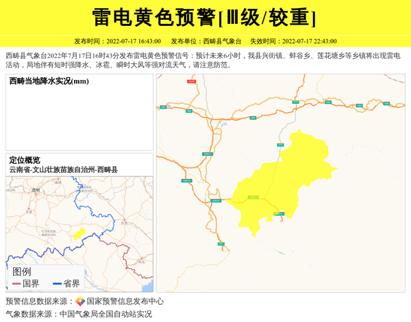 西畴县气象台2022年7月17日16时43分发布雷电黄色预警信号:预计未来6小时,我县兴街镇、蚌谷乡、莲花塘乡等乡镇将出现雷电活动,局地伴有短时强降水、冰雹、瞬时大风等强对流天气,请注意防范。 信息来源:国家预警信息发布中心; 发布单位:西畴县气象台。