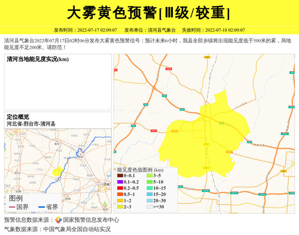 清河县气象台2022年07月17日02时06分发布大雾黄色预警信号:预计未来6小时,我县全部乡镇将出现能见度低于500米的雾,局地能见度不足200米。请防范! 信息来源:国家预警信息发布中心; 发布单位:清河县气象台。