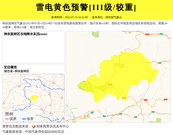 神农架林区气象台2022年07月15日16时17分发布雷电黄色预警信号:预计未来6小时,我区红坪镇及周边地区有雷电活动,雨量20-40毫米,阵风6-8级,请注意防范。 信息来源:国家预警信息发布中心; 发布单位:神农架气象台。