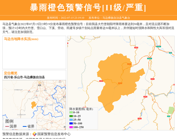马边彝族自治县气象台发布暴雨橙色预警信号[II级/严重]