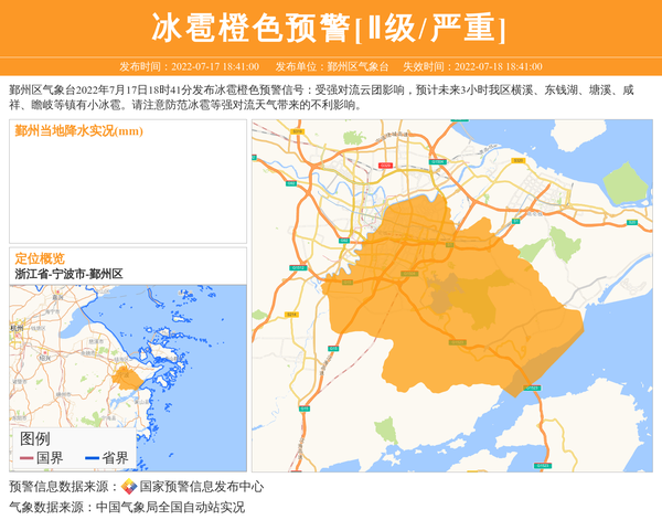 鄞州区气象台2022年7月17日18时41分发布冰雹橙色预警信号:受强对流云团影响,预计未来3小时我区横溪、东钱湖、塘溪、咸祥、瞻岐等镇有小冰雹。请注意防范冰雹等强对流天气带来的不利影响。 信息来源:国家预警信息发布中心; 发布单位:鄞州区气象台。