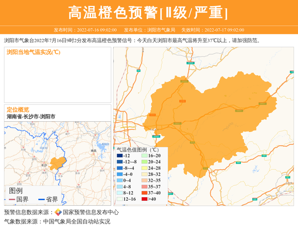 浏阳市气象台2022年7月16日9时2分发布高温橙色预警信号:今天白天浏阳市最高气温将升至37℃以上,请加强防范。 信息来源:国家预警信息发布中心; 发布单位:浏阳市气象局。