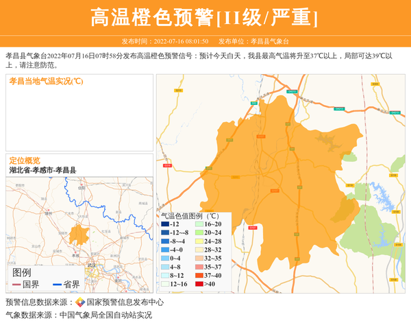 孝昌县气象台2022年07月16日07时58分发布高温橙色预警信号:预计今天白天,我县最高气温将升至37℃以上,局部可达39℃以上,请注意防范。 信息来源:国家预警信息发布中心; 发布单位:孝昌县气象台。