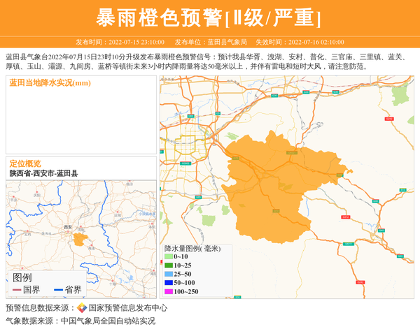 蓝田县气象台2022年07月15日23时10分升级发布暴雨橙色预警信号:预计我县华胥、洩湖、安村、普化、三官庙、三里镇、蓝关、厚镇、玉山、灞源、九间房、蓝桥等镇街未来3小时内降雨量将达50毫米以上,并伴有雷电和短时大风,请注意防范。 信息来源:国家预警信息发布中心; 发布单位:蓝田县气象局。