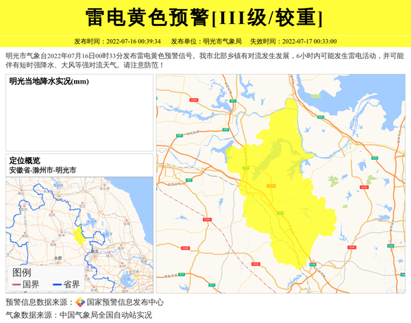 明光市气象台2022年07月16日00时33分发布雷电黄色预警信号。我市北部乡镇有对流发生发展,6小时内可能发生雷电活动,并可能伴有短时强降水、大风等强对流天气。请注意防范! 信息来源:国家预警信息发布中心; 发布单位:明光市气象局。