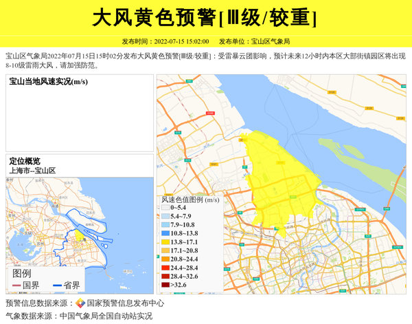 宝山区气象局2022年07月15日15时02分发布大风黄色预警[Ⅲ级/较重]:受雷暴云团影响,预计未来12小时内本区大部街镇园区将出现8-10级雷雨大风,请加强防范。 信息来源:国家预警信息发布中心; 发布单位:宝山区气象局。