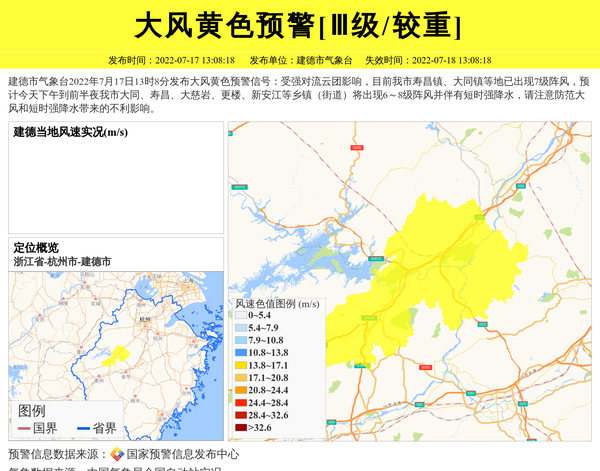 建德市气象台2022年7月17日13时8分发布大风黄色预警信号:受强对流云团影响,目前我市寿昌镇、大同镇等地已出现7级阵风,预计今天下午到前半夜我市大同、寿昌、大慈岩、更楼、新安江等乡镇(街道)将出现6~8级阵风并伴有短时强降水,请注意防范大风和短时强降水带来的不利影响。 信息来源:国家预警信息发布中心; 发布单位:建德市气象台。