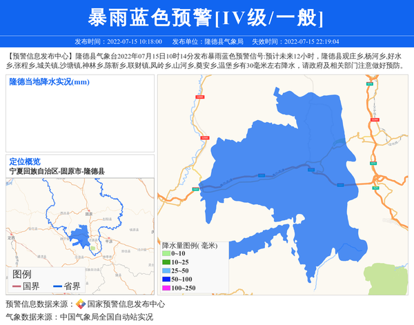【预警信息发布中心】隆德县气象台2022年07月15日10时14分发布暴雨蓝色预警信号:预计未来12小时,隆德县观庄乡,杨河乡,好水乡,张程乡,城关镇,沙塘镇,神林乡,陈靳乡,联财镇,凤岭乡,山河乡,奠安乡,温堡乡有30毫米左右降水,请政府及相关部门注意做好预防。 信息来源:国家预警信息发布中心; 发布单位:隆德县气象局。