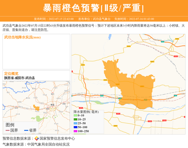 武功县气象台2022年07月15日22时43分升级发布暴雨橙色预警信号:预计下述地区未来3小时内降雨量将达50毫米以上:小村镇、大庄镇、普集街道办,请注意防范。 信息来源:国家预警信息发布中心; 发布单位:武功县气象台。