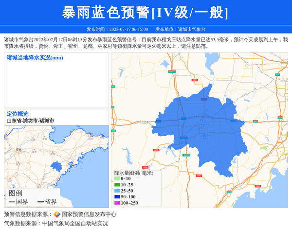 诸城市气象台2022年07月17日06时15分发布暴雨蓝色预警信号:目前我市程戈庄站点降水量已达53.5毫米,预计今天凌晨到上午,我市降水将持续,贾悦、舜王、密州、龙都、林家村等镇街降水量可达50毫米以上,请注意防范。 信息来源:国家预警信息发布中心; 发布单位:诸城市气象台。