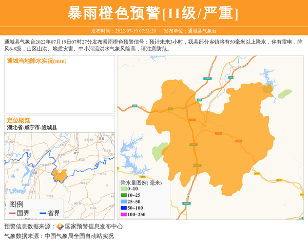 通城县气象台2022年07月19日07时27分发布暴雨橙色预警信号:预计未来3小时,我县部分乡镇将有50毫米以上降水,伴有雷电,阵风6-8级,山区山洪、地质灾害、中小河流洪水气象风险高,请注意防范。 信息来源:国家预警信息发布中心; 发布单位:通城县气象台。