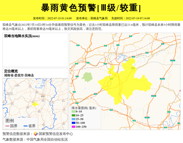 双峰县气象台2022年7月18日1时14分升级暴雨预警信号为黄色:过去1小时双峰县降雨量已达23.6毫米,预计双峰县未来5小时降雨量将达30毫米以上,累积雨量将达50毫米以上,致灾风险较高,请注意防范。 信息来源:国家预警信息发布中心; 发布单位:双峰县气象局。