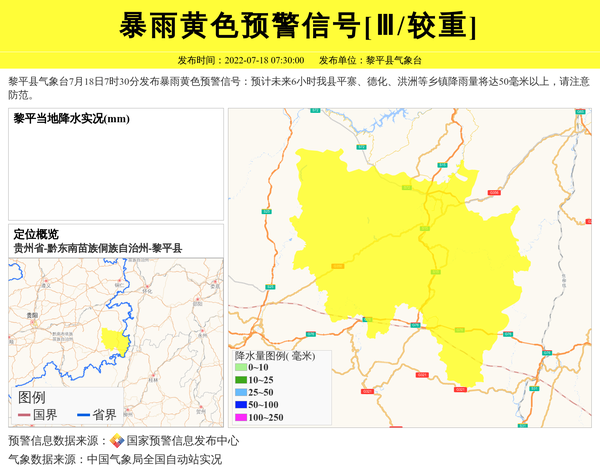 黎平县气象台7月18日7时30分发布暴雨黄色预警信号:预计未来6小时我县平寨、德化、洪洲等乡镇降雨量将达50毫米以上,请注意防范。 信息来源:国家预警信息发布中心; 发布单位:黎平县气象台。