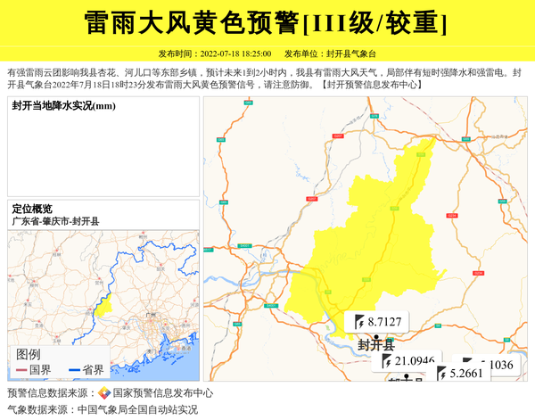 封开县气象台发布雷雨大风黄色预警[III级/较重]