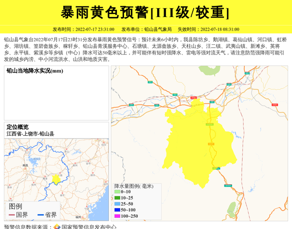 铅山县气象台2022年07月17日23时31分发布暴雨黄色预警信号:预计未来6小时内,我县陈坊乡、鹅湖镇、葛仙山镇、河口镇、虹桥乡、湖坊镇、篁碧畲族乡、稼轩乡、铅山县青溪服务中心、石塘镇、太源畲族乡、天柱山乡、汪二镇、武夷山镇、新滩乡、英将乡、永平镇、紫溪乡等乡镇(中心)降水可达50毫米以上,并可能伴有短时强降水、雷电等强对流天气,请注意防范强降雨可能引发的城乡内涝、中小河流洪水、山洪和地质灾害。 信息来源:国家预警信息发布中心; 发布单位:铅山县气象局。