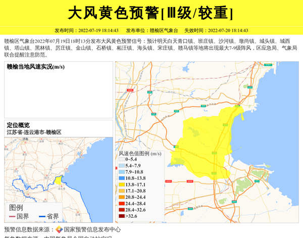 赣榆区气象台2022年07月19日18时13分发布大风黄色预警信号:预计明天白天青口镇、班庄镇、沙河镇、墩尚镇、城头镇、城西镇、塔山镇、黑林镇、厉庄镇、金山镇、石桥镇、柘汪镇、海头镇、宋庄镇、赣马镇等地将出现最大7-9级阵风,区应急局、气象局联合提醒注意防范。 信息来源:国家预警信息发布中心; 发布单位:赣榆区气象台。