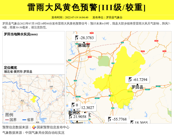罗田县气象台2022年07月19日14时00分发布雷雨大风黄色预警信号:预计未来6小时,我县大部乡镇将受雷雨大风天气影响,阵风7-9级,雨量30-50毫米,请注意防范。 信息来源:国家预警信息发布中心; 发布单位:罗田县气象台。