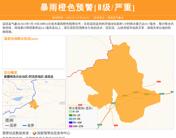 温宿县气象台2022年7月19日20时24分发布暴雨橙色预警信号:目前温宿县柯柯牙镇绿化新村1小时降水量已达20.7毫米,预计降水仍将持续,局地累计降雨量将达24.1毫米及以上,请注意防范强降水引发的洪水、泥石流、山体滑坡等地质灾害,请相关单位做好防御措施。 信息来源:国家预警信息发布中心; 发布单位:温宿县气象台。