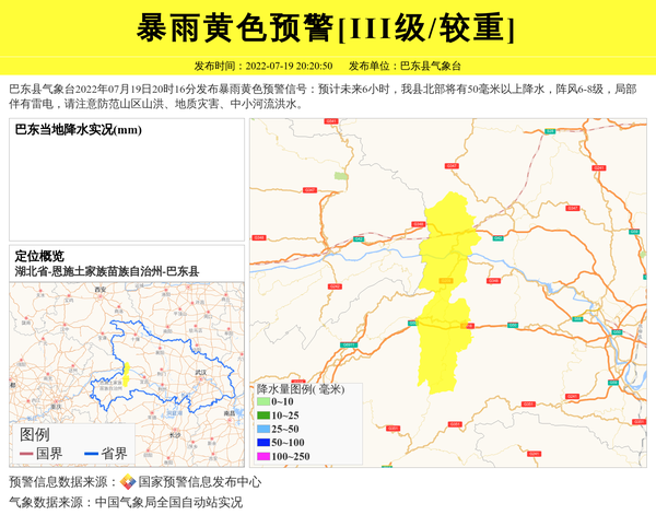 巴东县气象台2022年07月19日20时16分发布暴雨黄色预警信号:预计未来6小时,我县北部将有50毫米以上降水,阵风6-8级,局部伴有雷电,请注意防范山区山洪、地质灾害、中小河流洪水。 信息来源:国家预警信息发布中心; 发布单位:巴东县气象台。