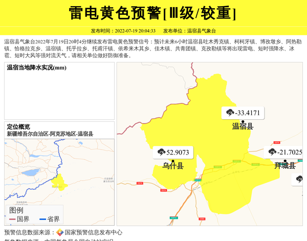 温宿县气象台发布雷电黄色预警[Ⅲ级/较重]