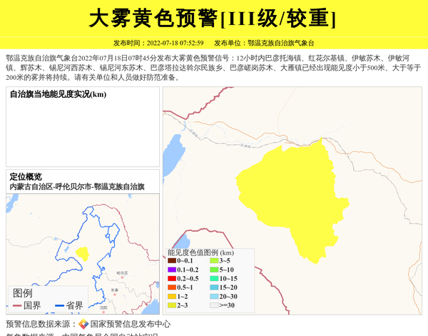 鄂温克族自治旗气象台2022年07月18日07时45分发布大雾黄色预警信号:12小时内巴彦托海镇、红花尔基镇、伊敏苏木、伊敏河镇、辉苏木、锡尼河西苏木、锡尼河东苏木、巴彦塔拉达斡尔民族乡、巴彦嵯岗苏木、大雁镇已经出现能见度小于500米、大于等于200米的雾并将持续。请有关单位和人员做好防范准备。 信息来源:国家预警信息发布中心; 发布单位:鄂温克族自治旗气象台。