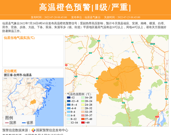 仙居县气象台2022年7月20日8时45分发布高温橙色预警信号:受副热带高压影响,预计今天我县福应、安洲、南峰、横溪、白塔、田市、官路、步路、大战、下各、双庙、朱溪等乡(镇、街道)平原地区最高气温将达38℃以上,局地40℃以上,请有关方面做好防暑降温工作。 信息来源:国家预警信息发布中心; 发布单位:仙居县气象台。