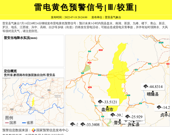 普安县气象台7月18日20时24分继续发布雷电黄色预警信号:预计未来3小时内我县盘水、南湖、茶源、九峰、楼下、青山、新店、罗汉、地瓜、江西坡、兴中、高棉、白沙等乡镇(街道)仍将发生雷电活动,可能会造成雷电灾害事故,并伴有短时强降水、大风等强对流天气,请注意防范。 信息来源:国家预警信息发布中心; 发布单位:普安县气象台。