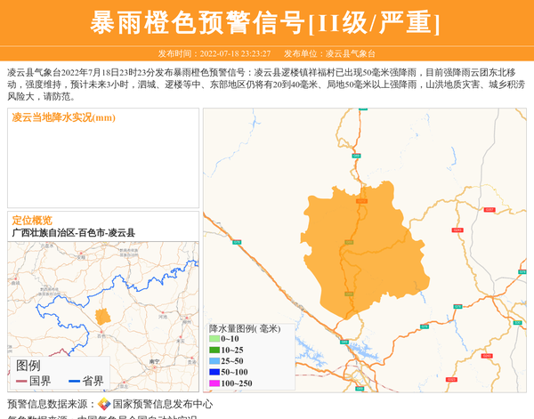 凌云县气象台发布暴雨橙色预警信号[II级/严重]
