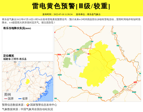 将乐县气象台2022年07月18日11时56分发布雷电黄色预警信号:预计未来6小时内我县部分乡镇有雷电活动,雷雨时局地伴有短时强降水、6-8级雷雨大风等强对流天气。请注意防范! 信息来源:国家预警信息发布中心; 发布单位:将乐县气象台。