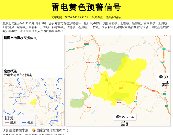 渭源县气象台2022年07月19日18时48分发布雷电黄色预警信号:预计6小时内,我县路园镇、北寨镇、新寨镇、麻家集镇、上湾镇、田家河乡、锹峪镇、秦祁乡、庆坪镇、祁家庙镇、清源镇、会川镇、五竹镇、大安乡等部分地区可能发生雷电活动,可能会造成雷电灾害事故。请有关单位和人员做好防范准备! 信息来源:国家预警信息发布中心; 发布单位:渭源县气象台。