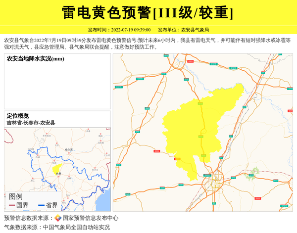 农安县气象台2022年7月19日09时39分发布雷电黄色预警信号:预计未来6小时内,我县有雷电天气,并可能伴有短时强降水或冰雹等强对流天气,县应急管理局、县气象局联合提醒,注意做好预防工作。 信息来源:国家预警信息发布中心; 发布单位:农安县气象局。