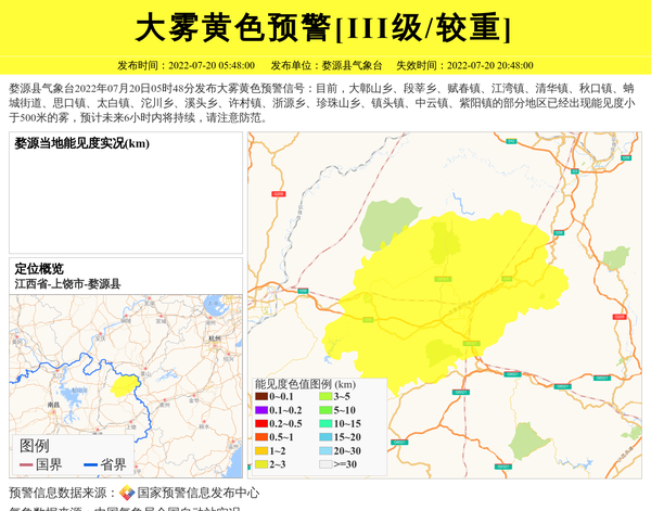 婺源县气象台2022年07月20日05时48分发布大雾黄色预警信号:目前,大鄣山乡、段莘乡、赋春镇、江湾镇、清华镇、秋口镇、蚺城街道、思口镇、太白镇、沱川乡、溪头乡、许村镇、浙源乡、珍珠山乡、镇头镇、中云镇、紫阳镇的部分地区已经出现能见度小于500米的雾,预计未来6小时内将持续,请注意防范。 信息来源:国家预警信息发布中心; 发布单位:婺源县气象台。