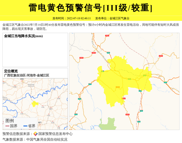 金城江区气象台2022年7月18日2时40分发布雷电黄色预警信号:预计6小时内金城江区将发生雷电活动,局地可能伴有短时大风或强降雨,易出现灾害事故,请防范。 信息来源:国家预警信息发布中心; 发布单位:金城江区气象台。