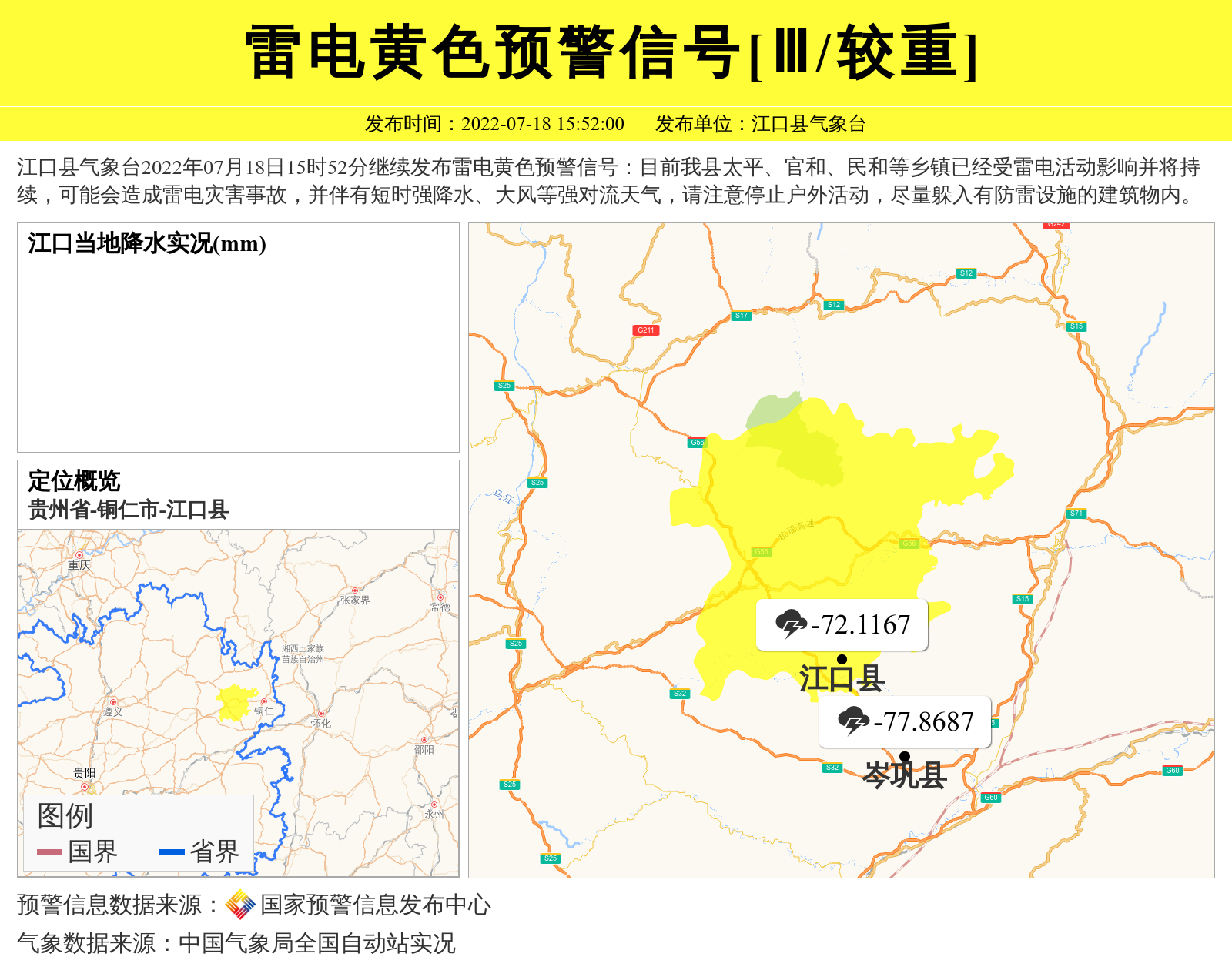 江口县气象台2022年07月18日15时52分继续发布雷电黄色预警信号:目前我县太平、官和、民和等乡镇已经受雷电活动影响并将持续,可能会造成雷电灾害事故,并伴有短时强降水、大风等强对流天气,请注意停止户外活动,尽量躲入有防雷设施的建筑物内。 信息来源:国家预警信息发布中心; 发布单位:江口县气象台。