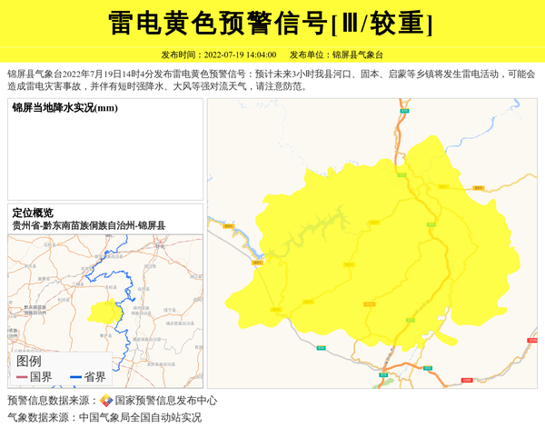 锦屏县气象台2022年7月19日14时4分发布雷电黄色预警信号:预计未来3小时我县河口、固本、启蒙等乡镇将发生雷电活动,可能会造成雷电灾害事故,并伴有短时强降水、大风等强对流天气,请注意防范。 信息来源:国家预警信息发布中心; 发布单位:锦屏县气象台。
