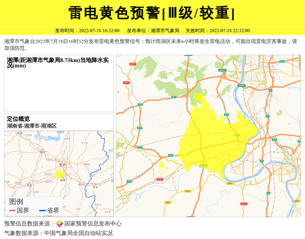 湘潭市气象台2022年7月18日16时32分发布雷电黄色预警信号:预计雨湖区未来6小时将发生雷电活动,可能出现雷电灾害事故,请加强防范。 信息来源:国家预警信息发布中心; 发布单位:湘潭市气象局。
