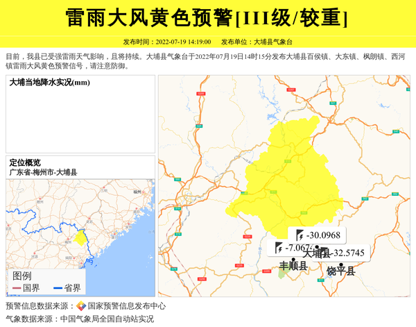目前,我县已受强雷雨天气影响,且将持续。大埔县气象台于2022年07月19日14时15分发布大埔县百侯镇、大东镇、枫朗镇、西河镇雷雨大风黄色预警信号,请注意防御。 信息来源:国家预警信息发布中心; 发布单位:大埔县气象台。