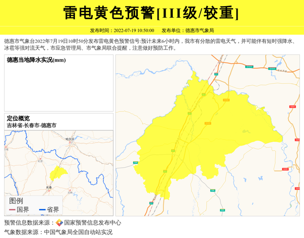 德惠市气象台2022年7月19日10时50分发布雷电黄色预警信号:预计未来6小时内,我市有分散的雷电天气,并可能伴有短时强降水、冰雹等强对流天气,市应急管理局、市气象局联合提醒,注意做好预防工作。 信息来源:国家预警信息发布中心; 发布单位:德惠市气象局。