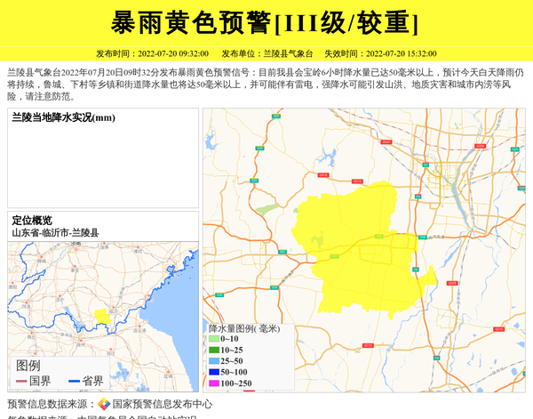 兰陵县气象台2022年07月20日09时32分发布暴雨黄色预警信号:目前我县会宝岭6小时降水量已达50毫米以上,预计今天白天降雨仍将持续,鲁城、下村等乡镇和街道降水量也将达50毫米以上,并可能伴有雷电,强降水可能引发山洪、地质灾害和城市内涝等风险,请注意防范。 信息来源:国家预警信息发布中心; 发布单位:兰陵县气象台。