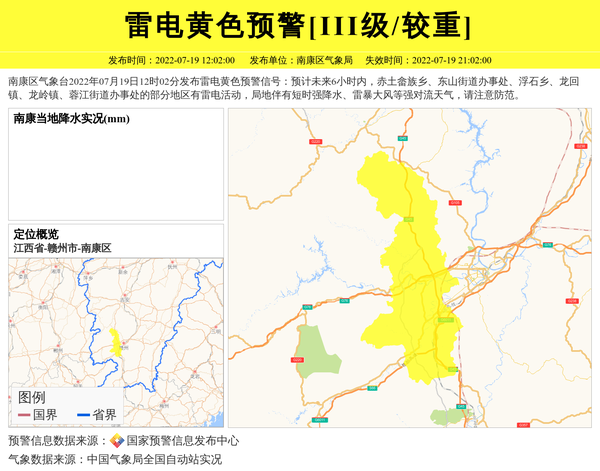 南康区气象台2022年07月19日12时02分发布雷电黄色预警信号:预计未来6小时内,赤土畲族乡、东山街道办事处、浮石乡、龙回镇、龙岭镇、蓉江街道办事处的部分地区有雷电活动,局地伴有短时强降水、雷暴大风等强对流天气,请注意防范。 信息来源:国家预警信息发布中心; 发布单位:南康区气象局。