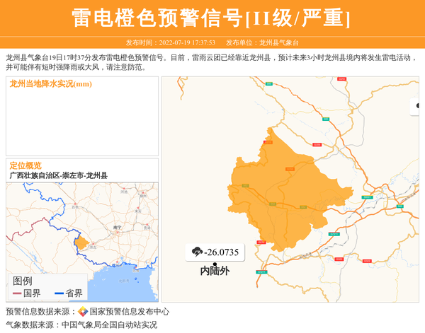 龙州县气象台19日17时37分发布雷电橙色预警信号。目前,雷雨云团已经靠近龙州县,预计未来3小时龙州县境内将发生雷电活动,并可能伴有短时强降雨或大风,请注意防范。 信息来源:国家预警信息发布中心; 发布单位:龙州县气象台。