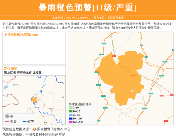 龙江县气象台2022年7月22日23时50分将2022年7月22日21时19分发布的暴雨黄色预警信号升级为暴雨橙色预警信号:预计未来3小时内龙江县、碾子山区降雨量将达50毫米以上,或者已达50毫米以上且降雨可能持续。请有关单位和个人注意做好预防工作。 信息来源:国家预警信息发布中心; 发布单位:龙江县气象台。