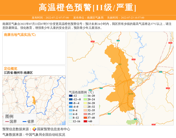 南康区气象台2022年07月22日07时57分变更高温橙色预警信号:预计未来24小时内,我区所有乡镇的最高气温将达37°C以上,请注意防暑降温。强化教育,增强青少年儿童的安全意识,预防青少年儿童溺水。 信息来源:国家预警信息发布中心; 发布单位:南康区气象局。