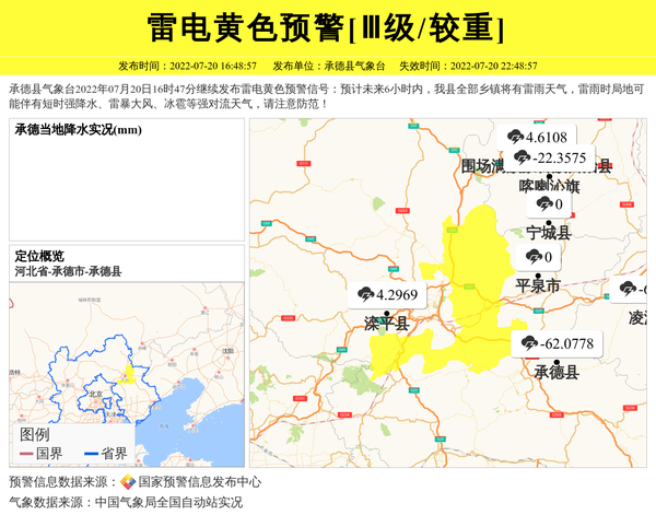 承德县气象台2022年07月20日16时47分继续发布雷电黄色预警信号:预计未来6小时内,我县全部乡镇将有雷雨天气,雷雨时局地可能伴有短时强降水、雷暴大风、冰雹等强对流天气,请注意防范! 信息来源:国家预警信息发布中心; 发布单位:承德县气象台。
