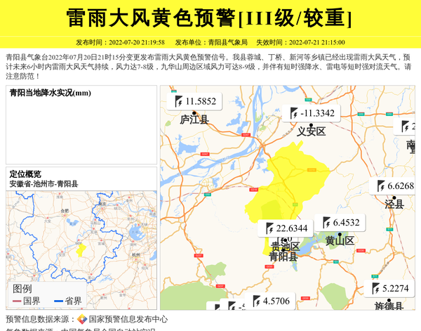 青阳县气象台2022年07月20日21时15分变更发布雷雨大风黄色预警信号。我县蓉城、丁桥、新河等乡镇已经出现雷雨大风天气,预计未来6小时内雷雨大风天气持续,风力达7-8级,九华山周边区域风力可达8-9级,并伴有短时强降水、雷电等短时强对流天气。请注意防范! 信息来源:国家预警信息发布中心; 发布单位:青阳县气象局。