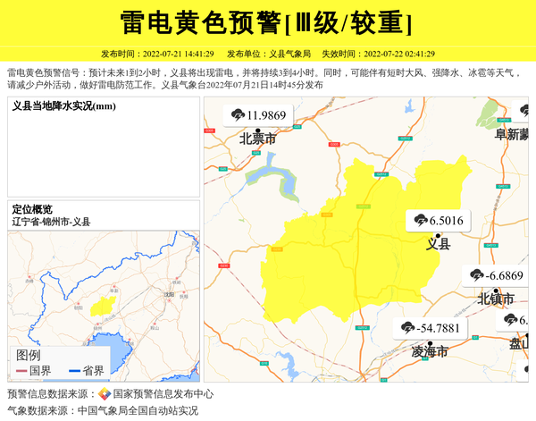 雷电黄色预警信号:预计未来1到2小时,义县将出现雷电,并将持续3到4小时。同时,可能伴有短时大风、强降水、冰雹等天气,请减少户外活动,做好雷电防范工作。义县气象台2022年07月21日14时45分发布 信息来源:国家预警信息发布中心; 发布单位:义县气象局。