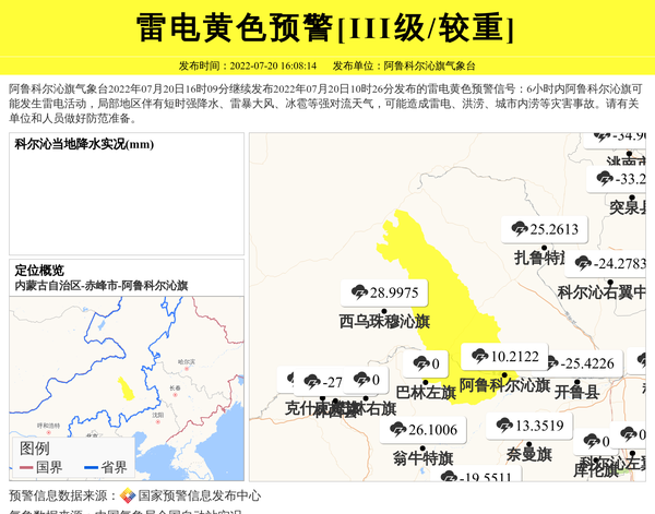 阿鲁科尔沁旗气象台2022年07月20日16时09分继续发布2022年07月20日10时26分发布的雷电黄色预警信号:6小时内阿鲁科尔沁旗可能发生雷电活动,局部地区伴有短时强降水、雷暴大风、冰雹等强对流天气,可能造成雷电、洪涝、城市内涝等灾害事故。请有关单位和人员做好防范准备。 信息来源:国家预警信息发布中心; 发布单位:阿鲁科尔沁旗气象台。
