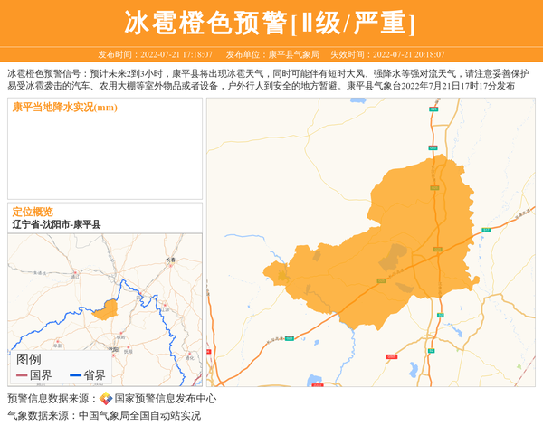 冰雹橙色预警信号:预计未来2到3小时,康平县将出现冰雹天气,同时可能伴有短时大风、强降水等强对流天气,请注意妥善保护易受冰雹袭击的汽车、农用大棚等室外物品或者设备,户外行人到安全的地方暂避。康平县气象台2022年7月21日17时17分发布 信息来源:国家预警信息发布中心; 发布单位:康平县气象局。