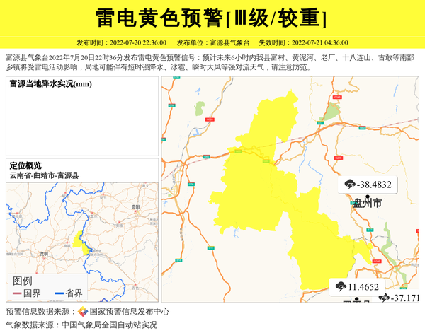 富源县气象台2022年7月20日22时36分发布雷电黄色预警信号:预计未来6小时内我县富村、黄泥河、老厂、十八连山、古敢等南部乡镇将受雷电活动影响,局地可能伴有短时强降水、冰雹、瞬时大风等强对流天气,请注意防范。 信息来源:国家预警信息发布中心; 发布单位:富源县气象台。
